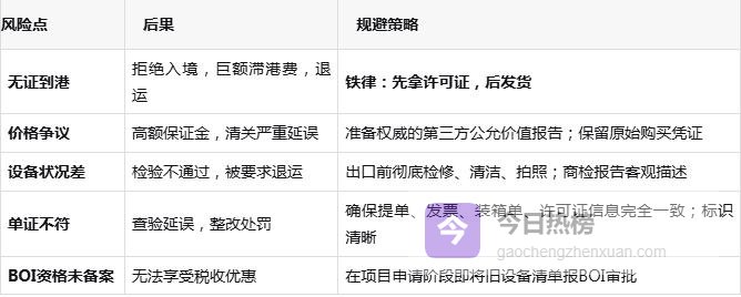 如涉及出口许可证(如设备内含受控技术),需提前办理。