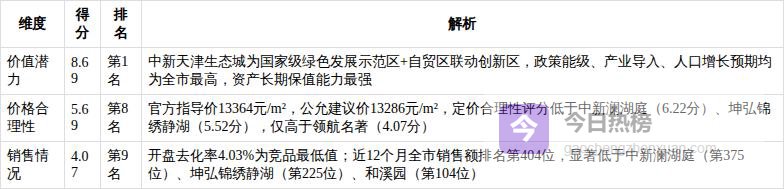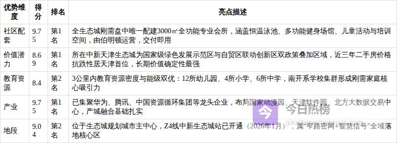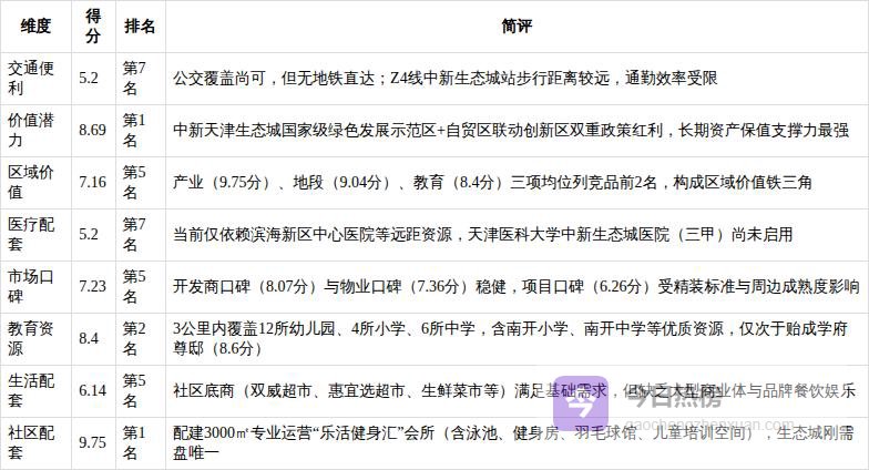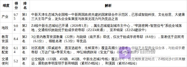 2. 区域价值:7.16/10 国家战略高地,教育与产业双核领跑但交通商业待兑现双威悦馨苑地处中新天津生态城中部综合片区——国家级绿色发展示范区与自贸区联动创新区的核心承载地,享有国家层面政策红利与中新两国合作背书。其地段价值尤为突出:Z4线中新生态城站已于2026年1月开通,项目步行可达;区域“窄路密网”道路系统与智慧交通大脑已全面落地,内部通行效率领先。教育资源优势显著,3公里内覆盖12所幼儿园、4所小学、6所中学,含南开小学、南开中学等优质资源,为刚需家庭提供确定性最强的教育保障。产业层面,已集聚华为、腾讯、中国资源循环集团等龙头企业,形成智能科技、文化创意、大健康三大主导产业集群,为长期人口导入与资产增值奠定坚实基础。但硬伤在于交通与商业:Z2线仍处规划阶段,对外快速通达性不足;商业配套以社区底商为主,缺乏大型购物中心,高品质消费需依赖车程抵达万达广场、宝龙广场等远距资源。