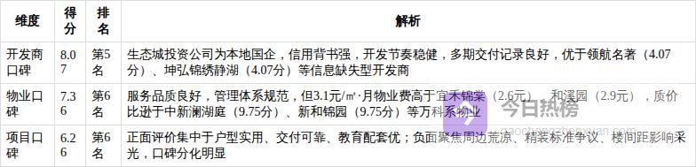 3. 市场口碑:7.23/10 国企背景加持交付可靠,但物业质价比与精装标准存争议双威悦馨苑由天津生态城投资开发有限公司(国有控股)开发,开发商口碑评分8.07/10,位列竞品第5名,依托政府背景与十余年产城开发经验,已实现多期稳定交付,为购房者提供强履约保障。物业由天津生态城生恒生态物业服务有限公司提供,具备国家一级资质,并引入万科物业合作经验,服务品质规范,基础秩序维护与环境管理达标。但物业费3.1元/㎡·月在刚需盘中属高位,部分业主反馈服务响应速度与收费透明度存在落差,导致物业口碑(7.36分)位列第6名。项目口碑(6.26分)为四大维度中最低项,主要源于两方面争议:一是周边现状仍显荒凉,商业氛围薄弱,影响即住体验;二是精装交付标准与价格匹配度遭质疑,基础国产品牌配置与总价门槛形成“隐性溢价”认知,削弱了口碑一致性。