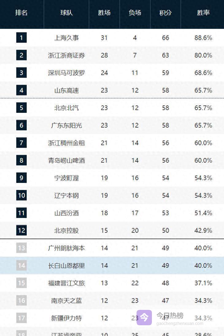 身后广州龙狮和吉林东北虎都是14胜21负,就差了那么一个胜场。 福建浔兴13胜22负,南京同曦和新疆伊力特都是12胜23负。 从第12到第17,六支球队挤成一团,谁输一场球排名就可能哗啦啦往下掉。