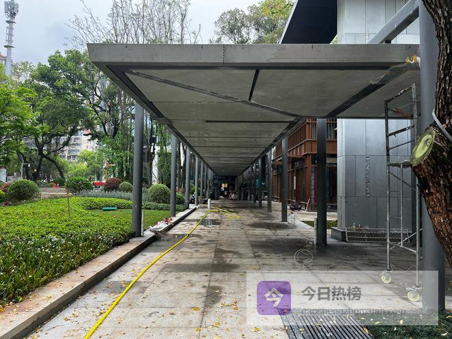 在广场的另一侧,风雨景观连廊的建设接近尾声。银灰色的金属廊架整齐排列,宽阔的廊顶为行人遮风挡雨,廊下的步道平整光洁,黄色的施工软管还未完全撤去,工人们正踩着脚手架,对廊架的细节进行最后的检修。不远处的红色高空作业车缓缓运转,工作人员忙着对周边的绿植进行修剪定型,每一株草木的姿态都被精心调整,力求与整体环境完美融合。