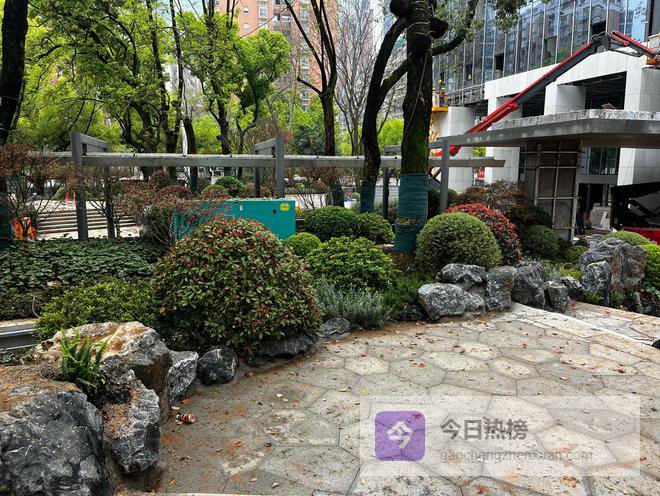 视线向右侧延伸,两栋已经建设完成的中式小楼是“迎客中心”所在地,工作人员正在进行室内物品摆放和陈设;楼内的餐饮门店也在进行最后的装修,各类陈设基本到位。沿着广场向前拾级而上,新铺就的石阶纹理清晰,台阶两侧的景观石与绿植搭配得恰到好处,既保留了烈士公园原有的生态底蕴,又融入了现代设计的简约质感。新栽种的灌木球与红叶石楠错落排布,搭配着形态各异的景观石,层次丰富的绿植造景初现雏形,为硬朗的建筑空间增添了自然的灵动。