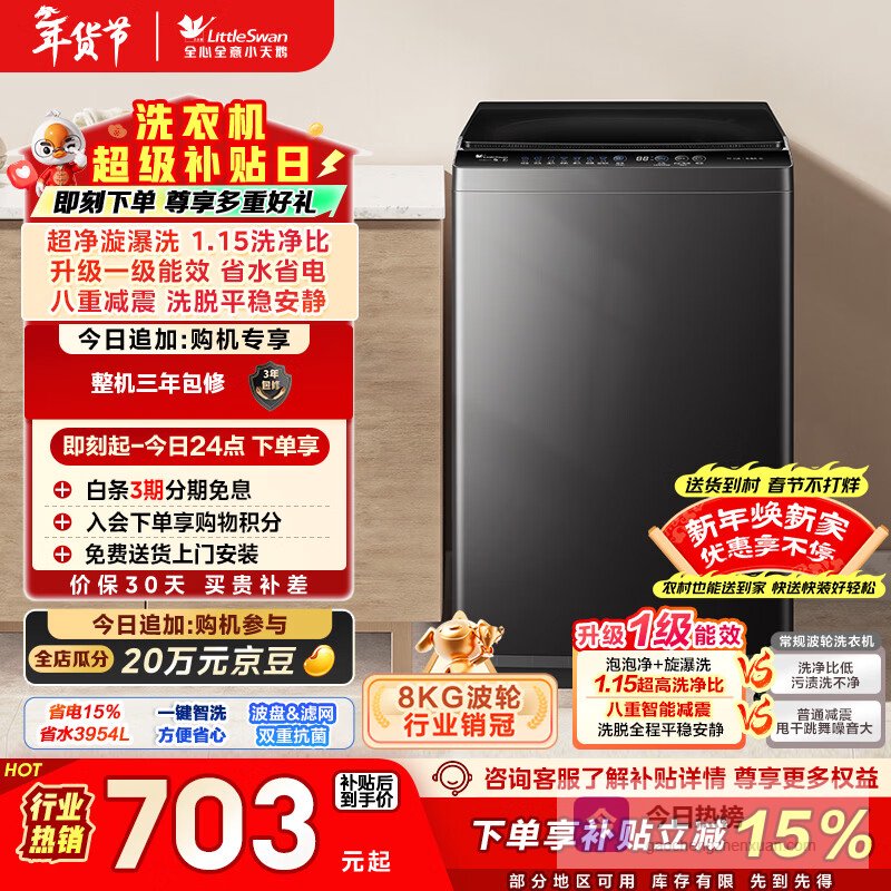 推荐入手:小天鹅波轮洗衣机TB80V27T 8公斤全自动