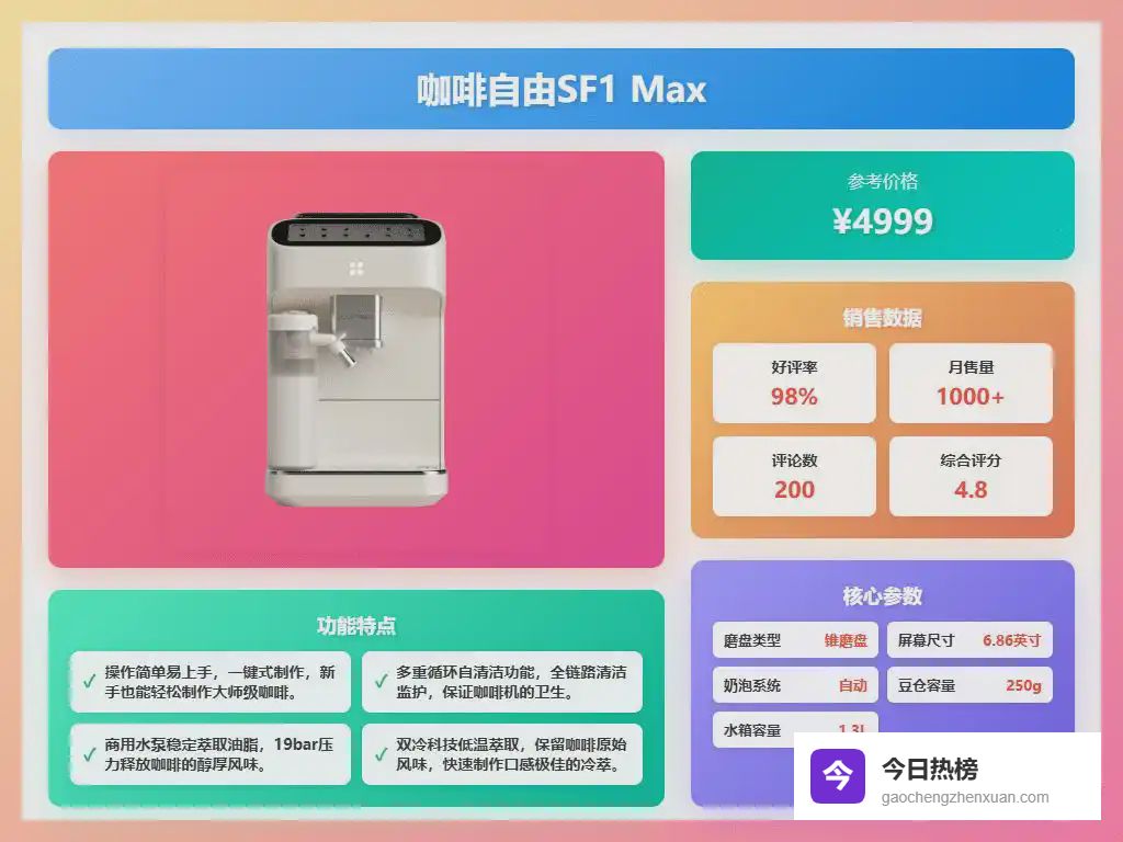 五、咖啡自由多样饮品轻松享:这台咖啡自由SF1 Max支持制作10种以上不同的咖啡和花式饮品,像拿铁、卡布奇诺、摩卡都能轻松搞定,不用跑咖啡店自己在家就能喝到多样口味的咖啡,挺方便的。