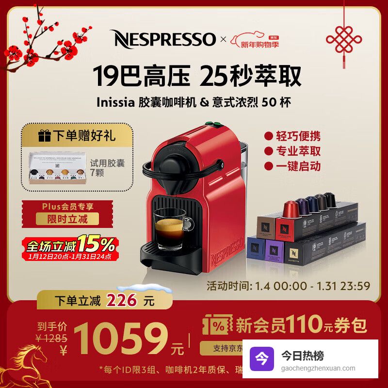 Nespresso奈斯派索胶囊咖啡机小型家用全自动商用办公室小巧便携高压萃取可折叠杯架意式进口新年礼物 C40 红色及意式浓烈5条装(赠试用胶囊7颗)¥