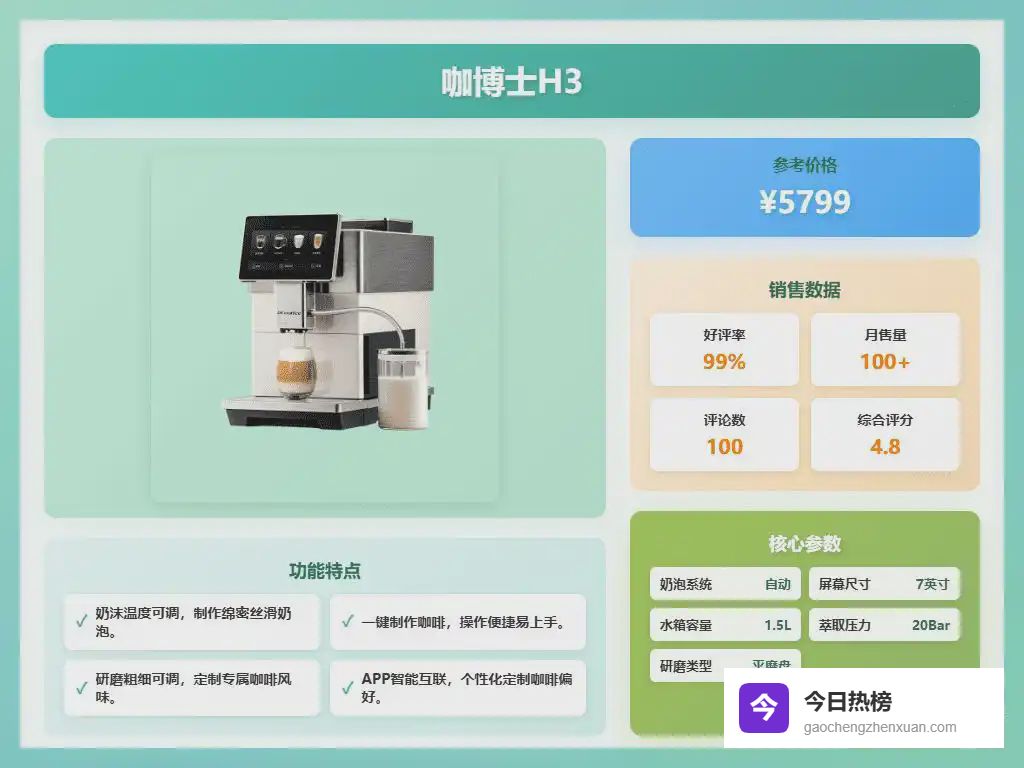 四、咖博士多样饮品支持:这款咖博士H3能制作超过10种不同的咖啡饮品,无论是喜欢热的拿铁、卡布奇诺,还是喜欢冰的冰美式、冷萃拿铁都能满足。尤其是冷热双模式萃取技术,让你随时随地轻松做出自己喜欢的咖啡,绝对比去咖啡厅方便多了,特别适合在家或办公室快速搞定一杯享受。