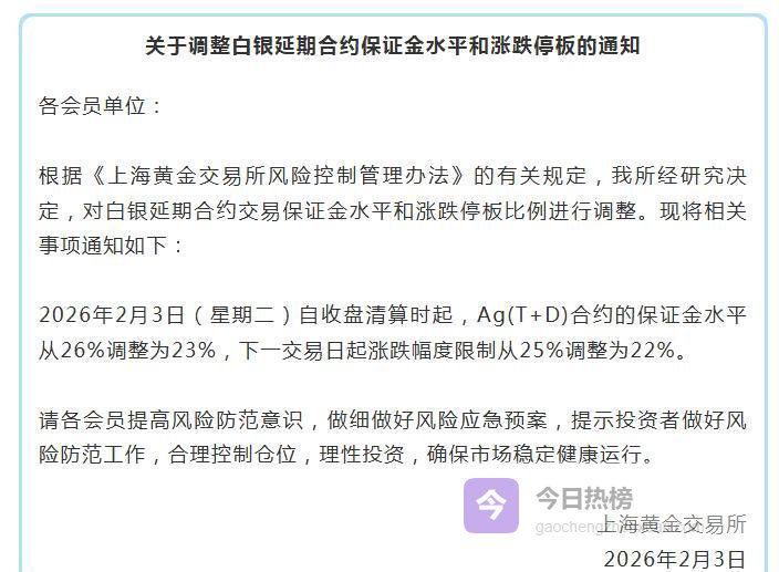 Ag(T+D)合约的 保证金水平由26%降至23%,涨跌停板则从25%缩至22%。