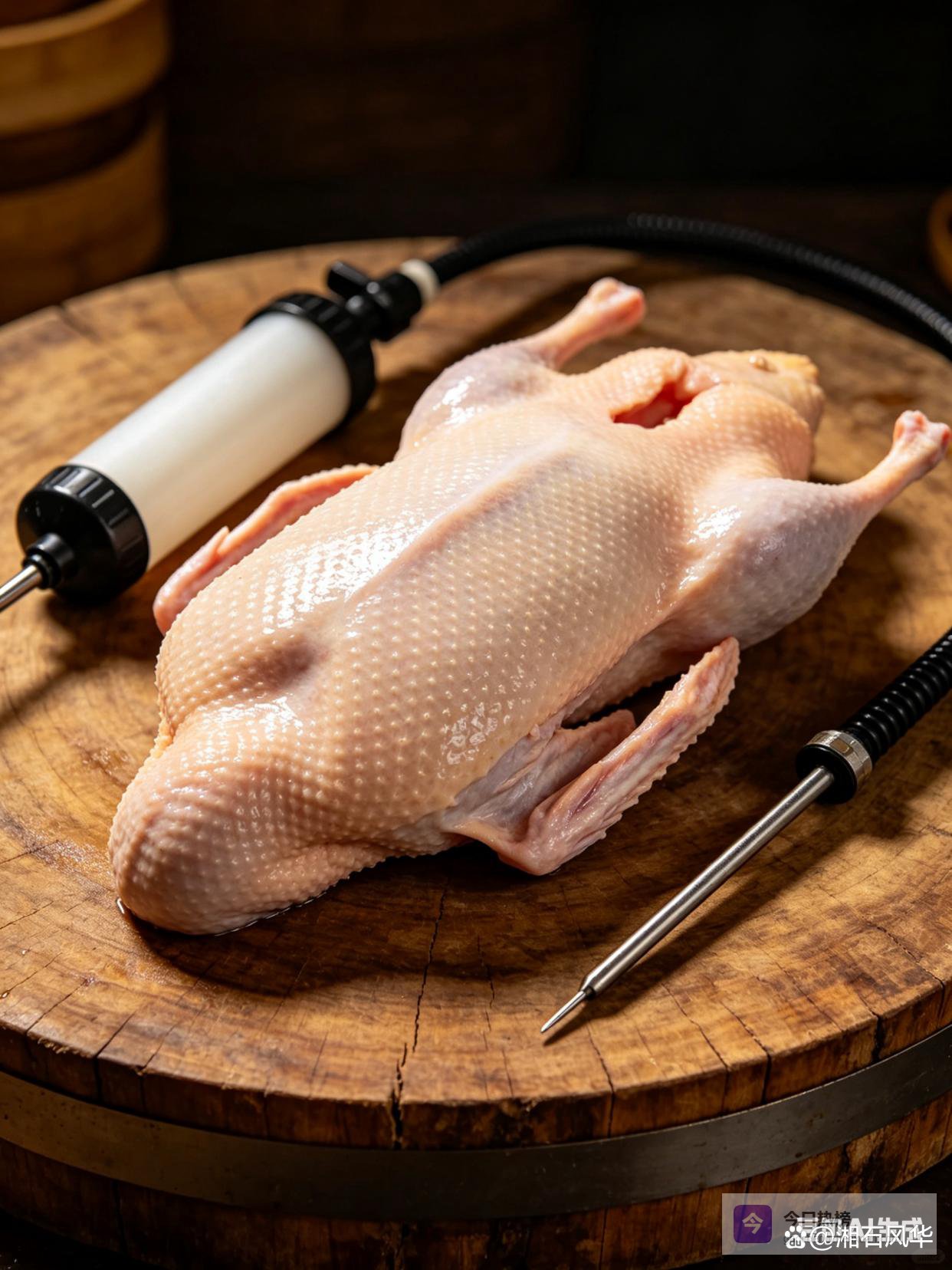 2. 气泵的管子从脖子开口塞进去,一只手掐住脖子根,另一只手按住刚才缝好的屁股。开气,“呼”一下,眼瞅着鸭子跟吹气球似的鼓起来,皮肉分家了就行。气别打太足,皮撑崩了可就白干了。