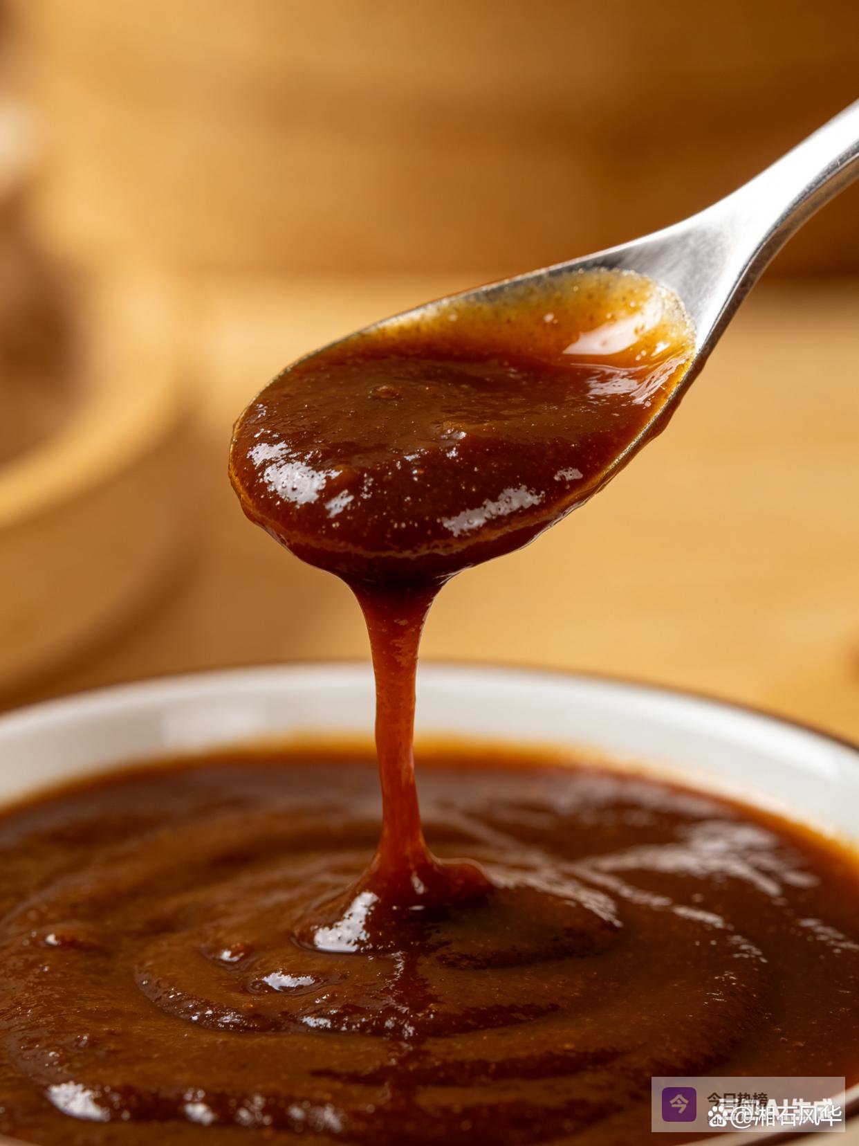6. 搅: 用勺子顺着一个方向搅。刚开始白糖化不开,水和香油都飘着,别急。搅个三五分钟,酱会越搅越稠。最后搅到看不见水珠和油星,酱体发亮,成了。