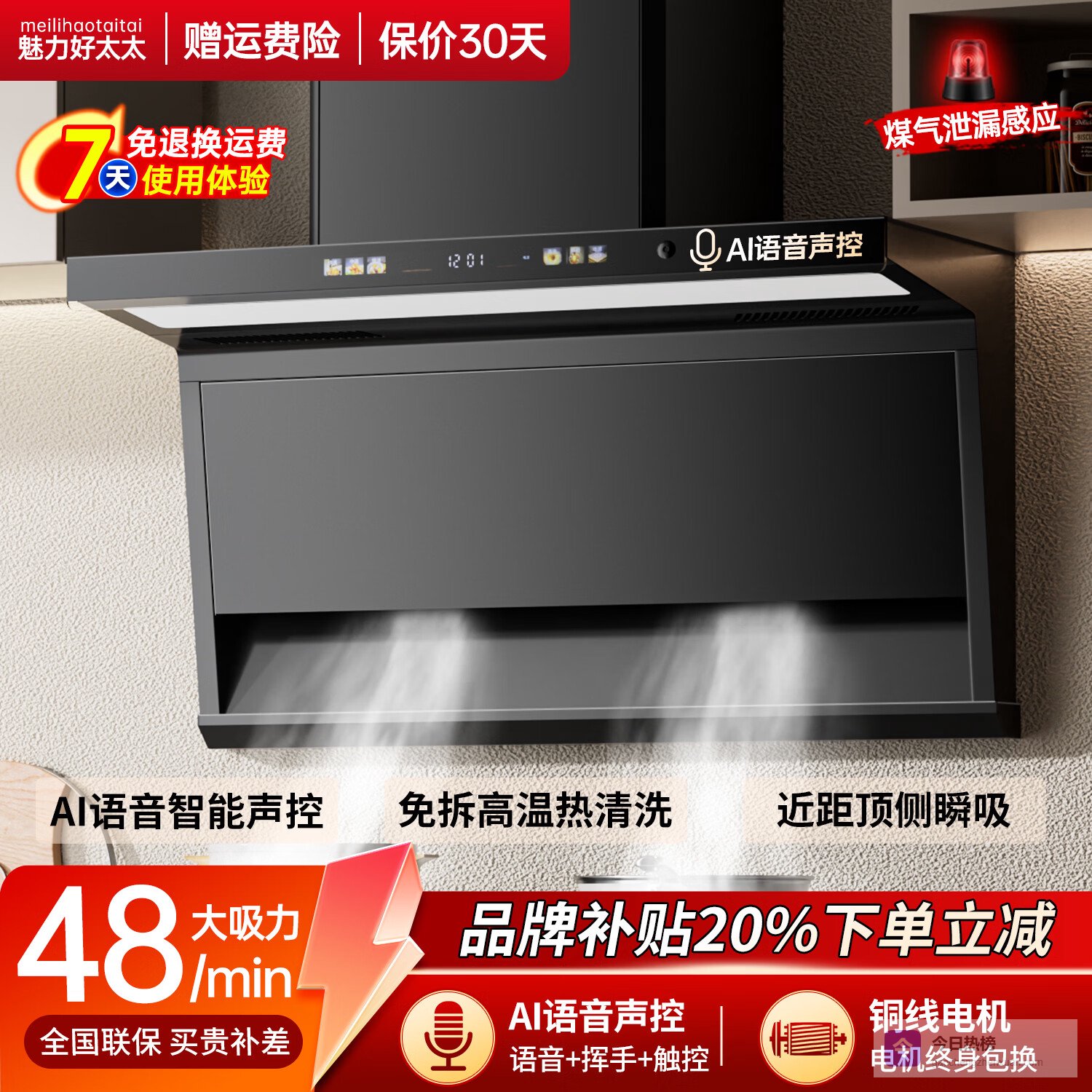 魅力好太太变频油烟机家用一级能效油烟分离顶侧双吸油烟机7字型家用抽油烟机爆炒风免清洗大吸力抽油烟机 90宽-语音声控-增压排烟-自动清洗-巨幕大灯 自行安装¥