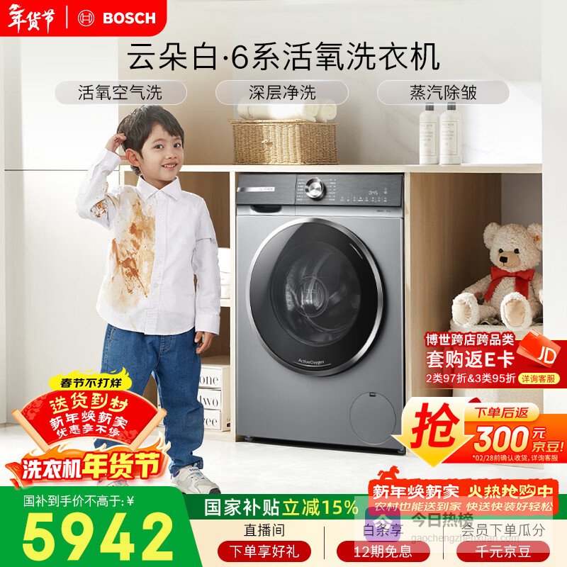 【京东自营】博世云朵白衣物护理中心智能投放99.99%除菌除病毒变频滚筒洗衣机WGA254D80W¥