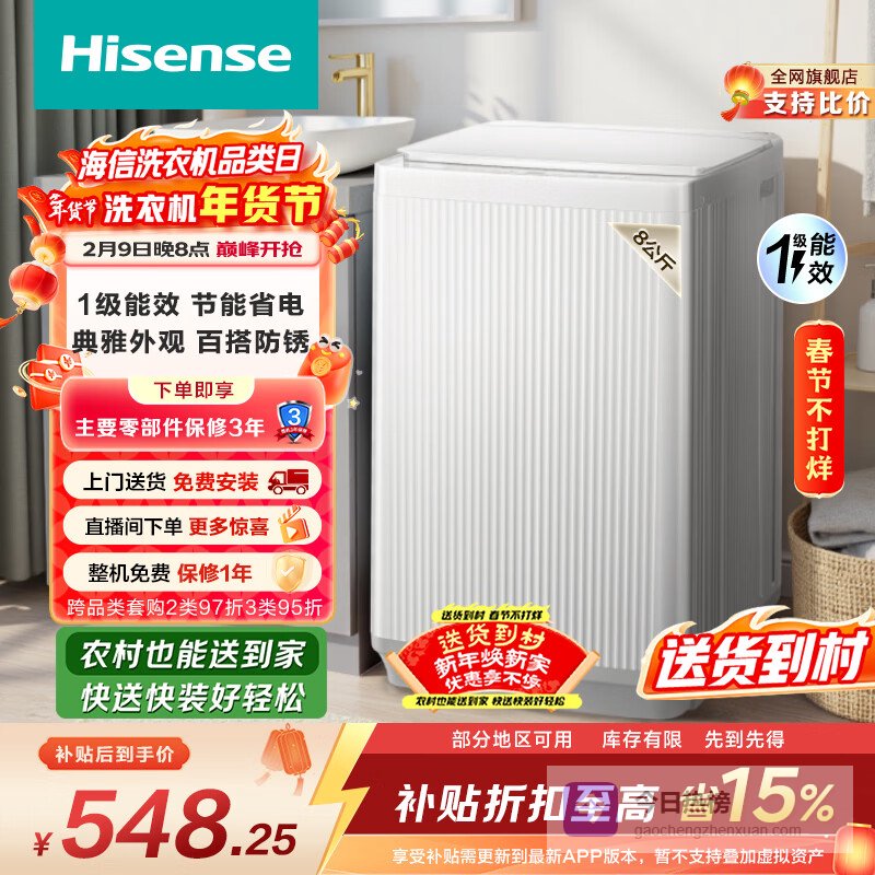 【京东自营】海信全自动波轮洗衣机8KG小型健康一级能效家用租房宿舍WT80N1Q以旧换新家电补贴京东¥