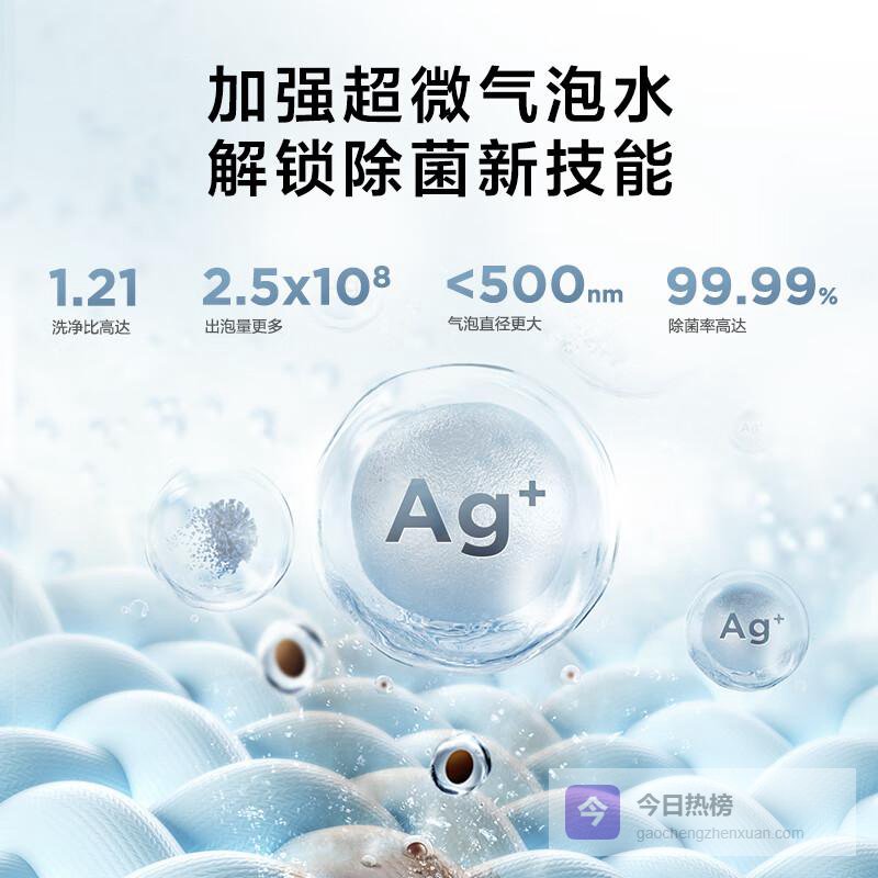 技术领先的超微气泡清洁系统,通过超微气泡及纳米银离子,实现高达99.99%的除菌率,让衣物清洁如新。洗净比达到1.21,有效去除各种污垢,确保您和家人的穿着安全,并带来健康的使用体验。