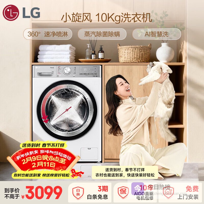 【京东自营】LG小旋风10KG滚筒洗衣机全自动家用大容量360°速净喷淋蒸汽除菌螨AI智慧洗FCW1¥