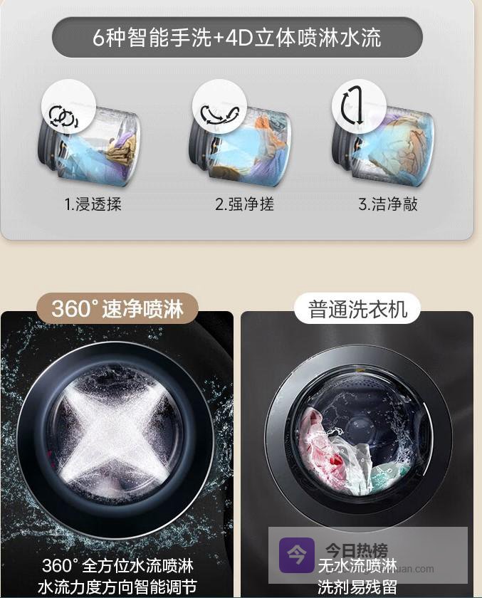 使用360°全方位水流喷淋系统的洗衣机,让每一次洗涤都能享受旋风速净洗的强大效果。搭载的6种智能手洗动作,能够深入衣物纤维,实现精准深层洗涤,显著提升洗衣洁净度,再也不必担心顽固污渍。