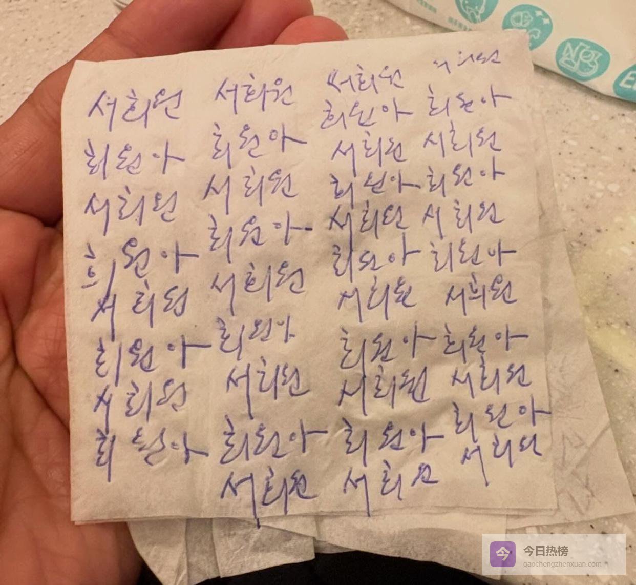 就算是在吃饭的时候,具俊晔也会因为太想念她,居然在餐厅的纸上不停写着“徐熙媛”的名字,怕被当成废纸扔掉,所以悄悄打算把它收藏起来。
