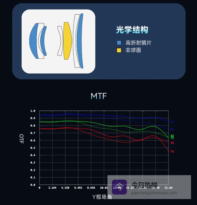 从MTF曲线可以看出,中心锐度尚可,不过边缘低到0.4左右。镜组有6组7片,包含1片非球面镜片。