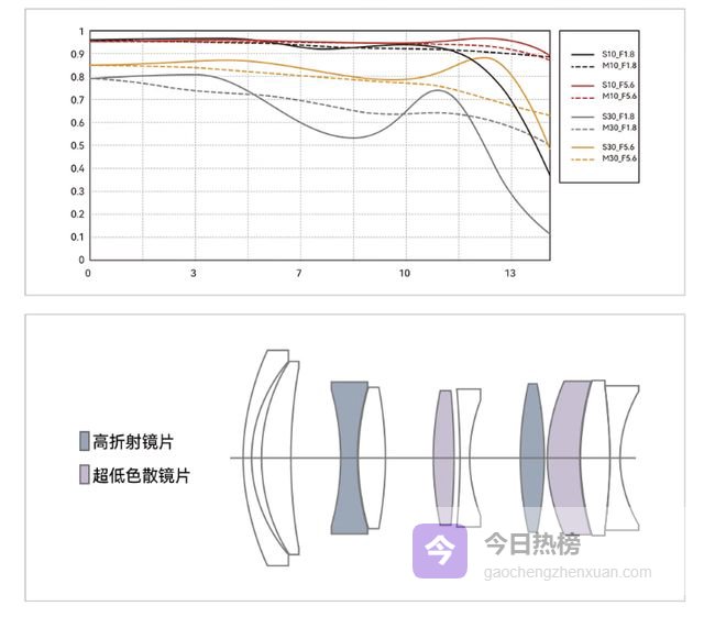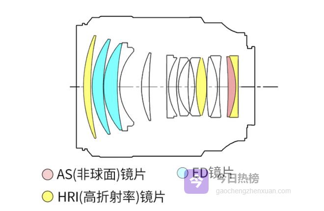 镜片为9组14片,包含1片非球面镜片,2片ED低色散镜片,3片高折射镜片。