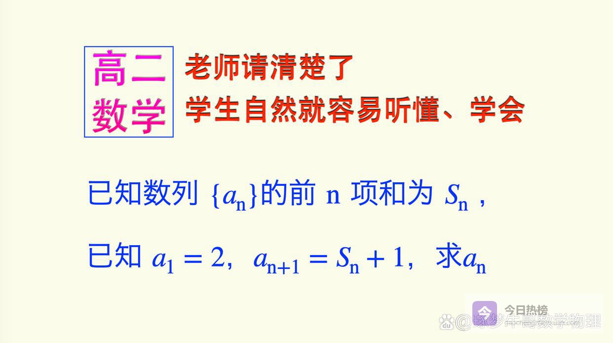 从理论上来说,这应该是这个视频的核心(之一),但是,从数列来说,这个问题好像又不存在:当n=1时,a_1表示数列的第一项,S_1表示这个数列的前1项和;但它真正讲的,我认为是一个“无中生有”的问题,并非上述两种情况之一,也就是说:它从一开始就给学生挖了个坑,然后再带着学生往坑里跳。