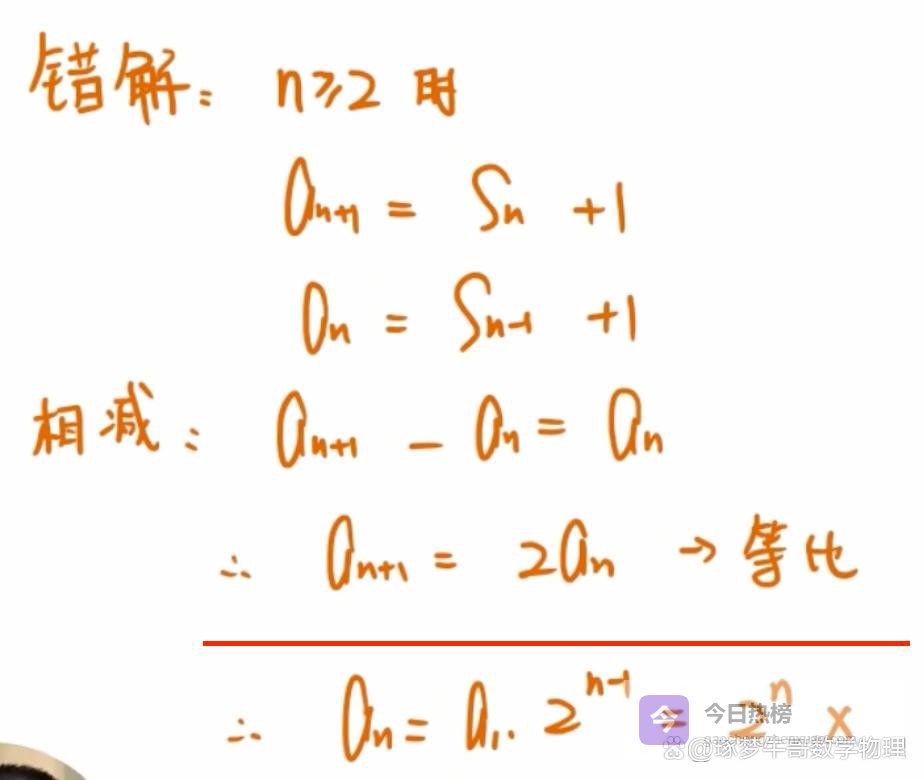 首先,它提供的错解里,前提条件是“当n≥2时”,它在话述里也强调了这一点,也就是说这个做法数列的第二项开始做的;但是最后它却直接代入了数列的首项a1(上图中红线下方),这明显扩大了n的范围:与其说这是学生存在的“误区”,不如说是因为学生粗心、马虎或基础不扎实而产生的低级错误,直接指出来就可以了;上图中,如果把“n≥2”理解成“从数列 {a_n }的第二项开始”,红线上方的过程就是正确的,只是最后的结论错了而已,正确的结果应该是“ a_n=a_2×2^{n-1} , n≥2 ” ,接下来,很明显就是要根据 “a_1=2求 a_2 ”了(如果没有给出 a_1的值,就把 “a_2=a_1+1 ”代入上边的结果);如果错误答案中没有 “ n≥2 ” 这个细节,倒是容易出现它最后写的那个式子,问题不同,但本质一样;