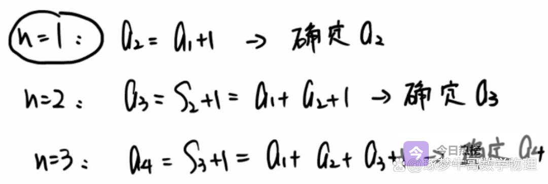 第二,偷换/混淆 概念:已知条件“a_{n+1}=S_{n}+1”里有三个隐藏信息:(1)n是从1开始的;(2)等式中数列{ a_n } 的项数是n+1,即从数列第二项起,数列中的每一项都满足等式;(3)如果把这个前n项和看成一个新数列,{ S_1 , S_2 , S_3 , ... , S_n } ,已知等式中的 n,表示这个新数列的项数,即数列 { a_n } 的前n项和,都满足已知等式;对于基础扎实的学生来说,看到已知条件就能理解到上面三种意思,只是很多学生可能没有意识到;