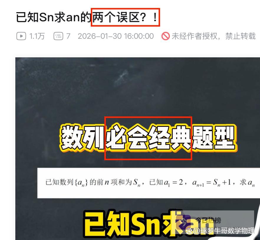 我的理解恰好与它相反:基础扎实的学生,很容易就能做对、做好这道题,就像每个身体健康的孩子都能学会走路一样自然;我相信可能有不少刚学完数列的学生,会犯它视频中的错误(指“错解”中去掉“当n≥2时”这个条件),但基础扎实的同学几乎不会重复犯那样的错误;如果老师能真的把基础知识讲清、讲透,几乎所有学生都可以避免出现那样的错误;简单地说,它强调的“两大误区”实际上是不存在的,即使学生出现了它说的“误区”,那也不能证明是学生学的问题,而更可能是老师教的有问题,可能老师一开始就教错了!