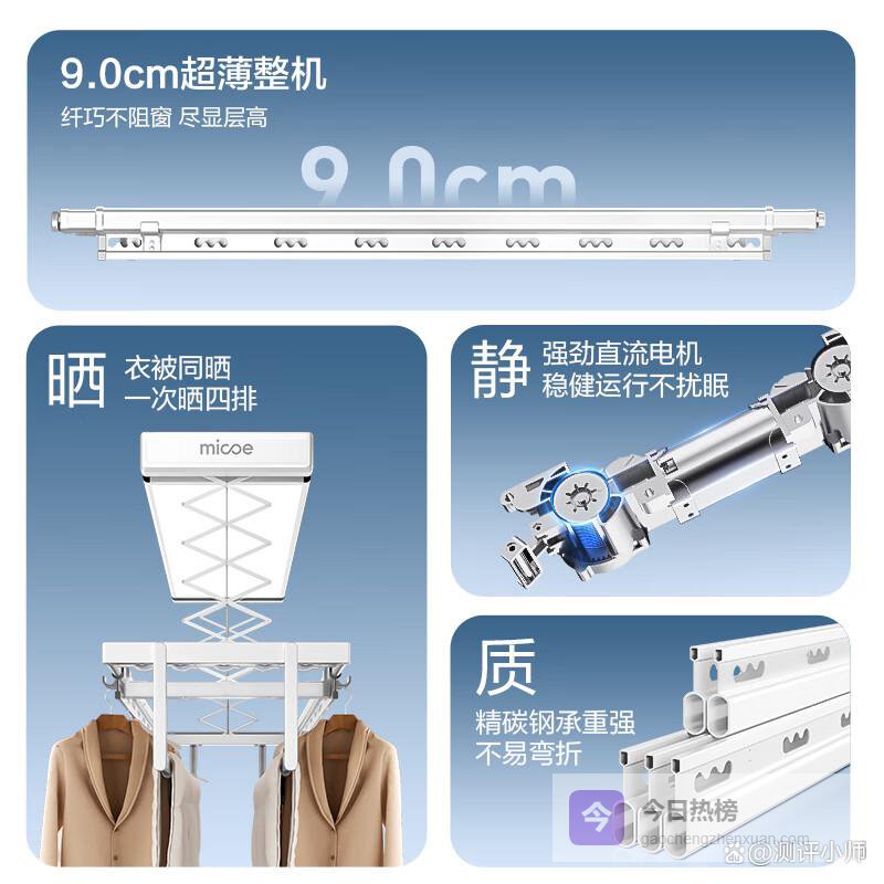 这款智能晾衣机具有创新的离线语音控制,无需使用遥控器,只需简单的语音命令,便能轻松操控,方便省心。它的超薄设计,厚度仅为9.5cm,能够完美融入各种家装风格,不会遮挡窗户,非常适合不同家庭使用。强大的承重能力,支持35kg动态和50kg静态重量,满足全家衣物的晾晒需求,让家人安心。