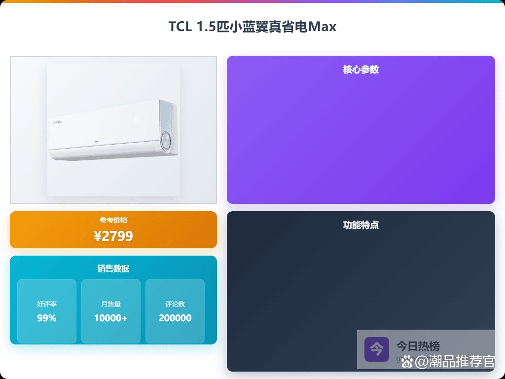 最近想换个空调,家里的旧空调实在太费电了,而且制冷效果也跟不上。寻思着买个1.5匹的,一直听说TCL的空调还不错,身边也有朋友在用,都说挺省电的。所以就开始研究“TCL1.5匹空调哪款性价比高?”这问题,毕竟谁不想花最少的钱,买到最实用的东西呢?而且,在节能省电的前提下,耐用性也要考虑进去,不然没用两年就坏了,那可就得不偿失了。