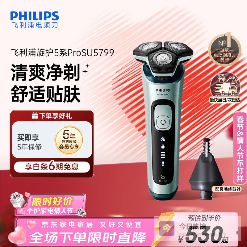 推荐理由:飞利浦SU5799/06蜂巢5系电须刀,搭载SkinIQ肌能感应科技,能智能识别胡须硬度,实时调节转速,轻松应对各种胡须,告别反复刮剃的烦恼。50分钟续航,1小时充电,满足日常剃须需求。360度灵动刀头,五边形设计,轻松贴合面部轮廓,即使是下颚、人中这些难剃部位也能轻松应对。全身水洗,方便清洁,保持卫生。
