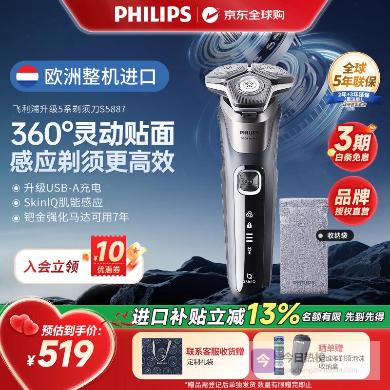 推荐理由:飞利浦蜂巢5系S5887/10剃须刀,搭载了先进的SkinIQ智能胡须感应器,能够读取胡须密度,速度提升至250次/秒,比前代产品快一倍,这意味着剃须更加精准、高效。90,000次/分钟的切割动作,让剃须过程快速且轻松。整机进口钯金强化马达,提供更长的电池和电机使用寿命,可达7年,保证了剃须刀的耐用性。而且,这款剃须刀支持USB-A充电,全球通用电压,出差旅行携带更方便。