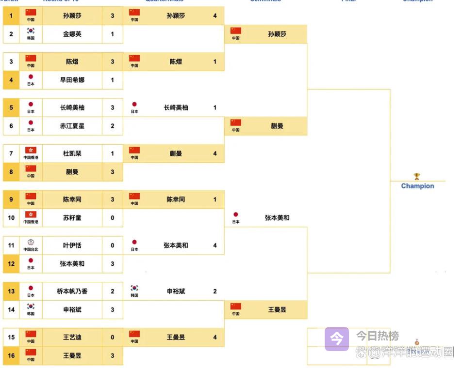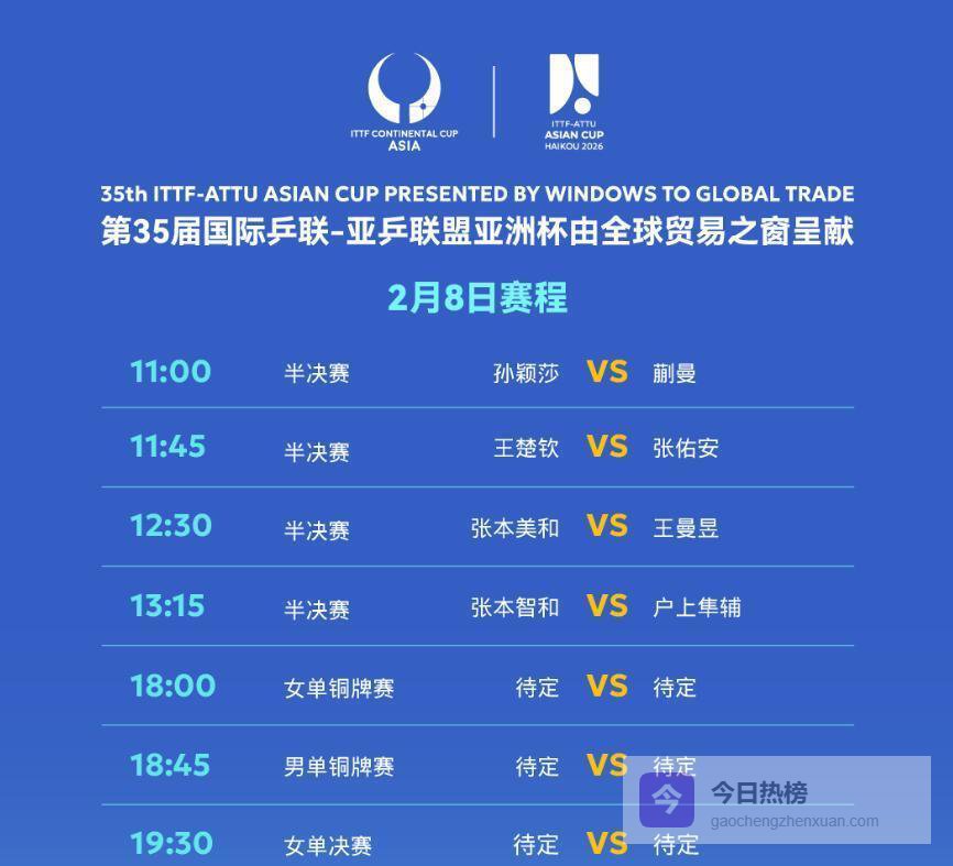今晚之后,亚洲杯的决赛对阵即将产生。 王楚钦对阵张佑安,张本智和对阵户上隼辅;女单则是孙颖莎与蒯曼的内战,以及王曼昱与张本美和的焦点对决。
