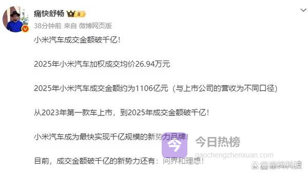 近日,据汽车博主“痛快舒畅”爆料称,小米汽车在2025年实现历史性突破,全年成交金额成功跨越千亿门槛,达到约1106亿元人民币,加权成交均价为26.94万元。