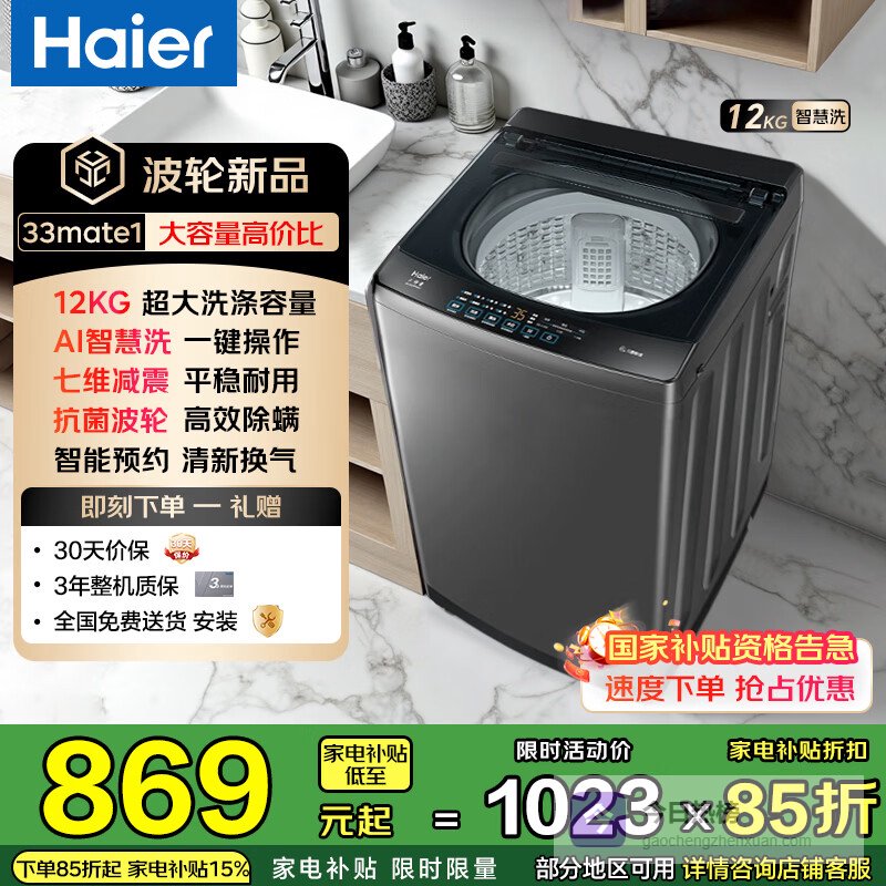 【品牌直营】海尔波轮洗衣机全自动10/12公斤大容量家用静音电机抗菌波轮高效除螨家电补贴立减15%送¥