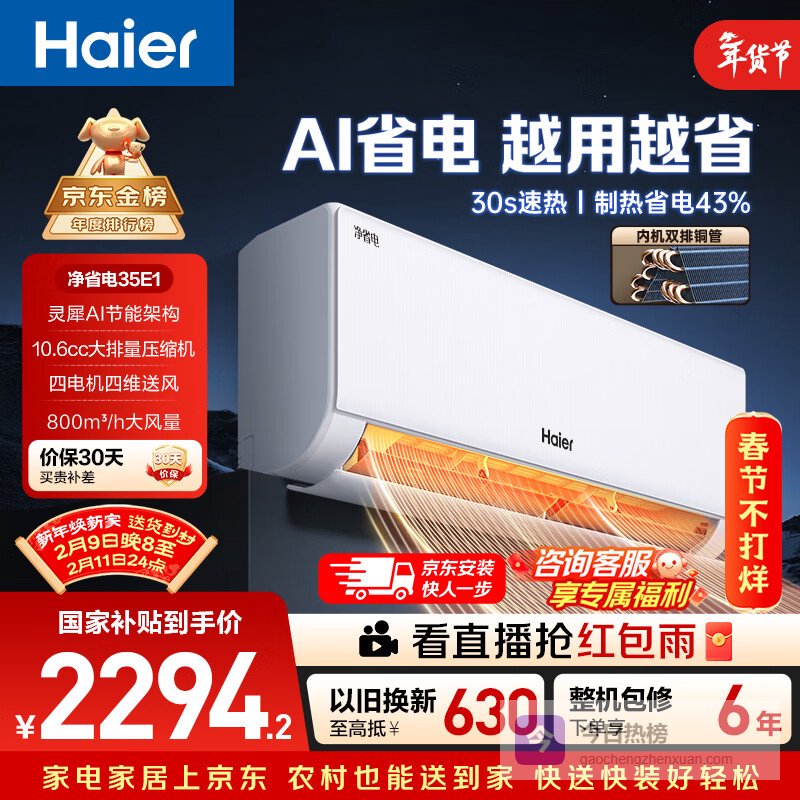 海尔空调净省电 大1.5匹超一级能效冷暖变频挂机 双排铜管蒸发器 家电国家补贴以旧换新KFR-35GW/E1-1¥