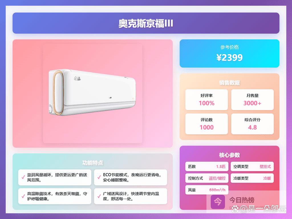 八、奥克斯【变频节能】这款空调采用变频技术,能根据房间温度自动调节运行速度,不会一直开到最大,既省电又稳妥。它的一级能效,用电还挺省的,既环保又省钱,特别适合想节能省电的家庭。