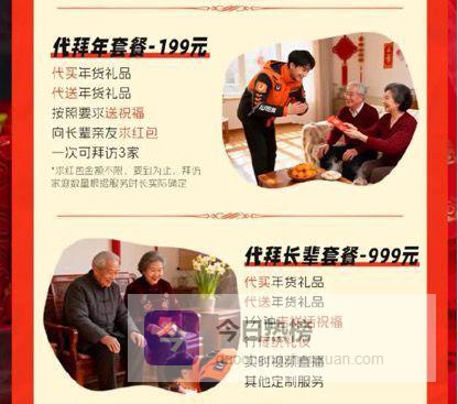 据界面新闻报道,UU跑腿推出“代拜年帮尽孝”服务在今年春节期间引发了广泛关注。从UU跑腿官方宣传海报及服务细则来看,此次推出的代拜年服务共分三档套餐:69元代贴春联套餐,包含代买张贴春联福字及门口基础清洁;199元代拜年套餐,可代买代送年货、传递祝福并向长辈亲友求红包,一次可拜访3家;999元代拜长辈套餐中,除代买送年货外,还涵盖1分钟吉祥话祝福、行传统礼仪及实时视频直播等定制服务,而行传统礼仪便包括代磕头行礼。