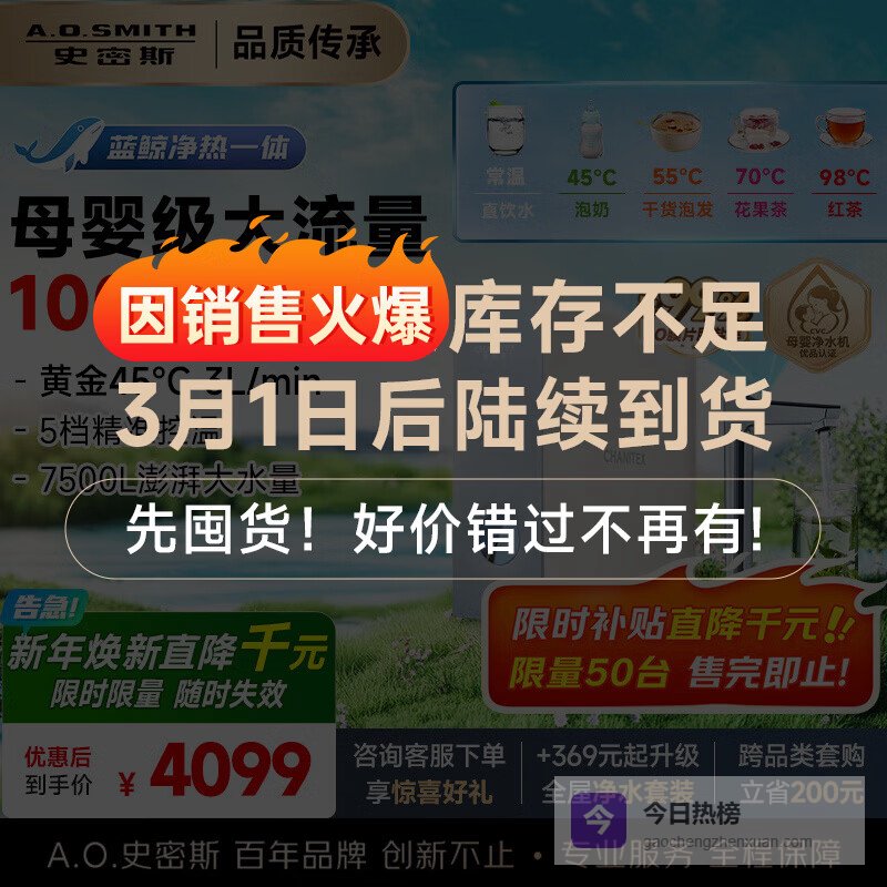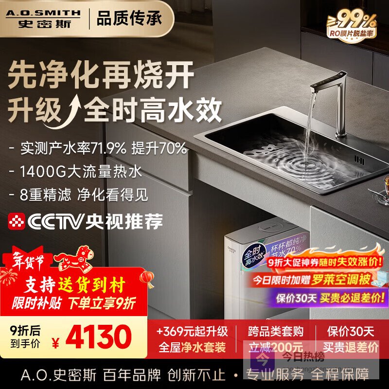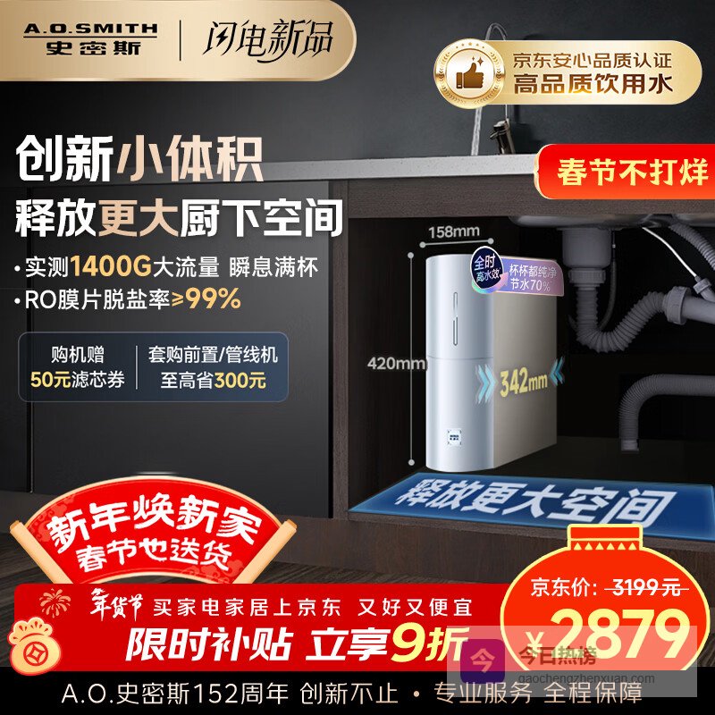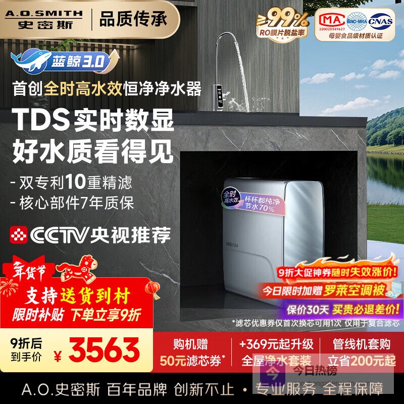 史密斯(A.O.SMITH)佳尼特净水器家用加热直饮一体厨下净水机净饮机蓝鲸净热一体Pro CDR2000S1 3L/min母婴级净水 100℃真开水¥