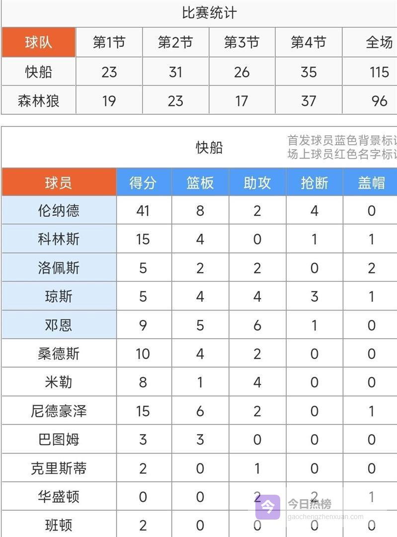 整个第四节都成了垃圾时间。伦纳德没有再登场,他坐在替补席上,肩上敷着冰袋,平静地看着队友打完剩余的比赛。快船队的年轻球员们得到了充足的锻炼时间,尼德豪泽继续展示着他的冲击力,又完成了两次上篮。终场哨响,115-96的比分牌格外醒目。快船全队有6人得分上双,除了伦纳德的41分,约翰·科林斯得到15分,大洛佩斯有12分9篮板,新秀尼德豪泽在17分钟内高效拿下15分6篮板。