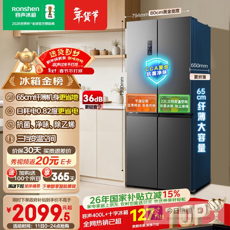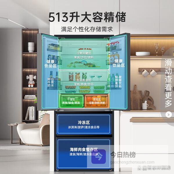 第2款:容声BCD-465WD18FP容声这款冰箱,465L的总容量确实挺能装的,冷藏区、冷冻区分区明确,还有个变温区可以灵活调整。对于三口之家或者平时喜欢囤货的朋友来说,空间基本够用。而且它这个90度直角开门设计倒是挺贴心的,能更好地适应各种厨房布局,嵌入式安装也更方便,不会显得突兀。
