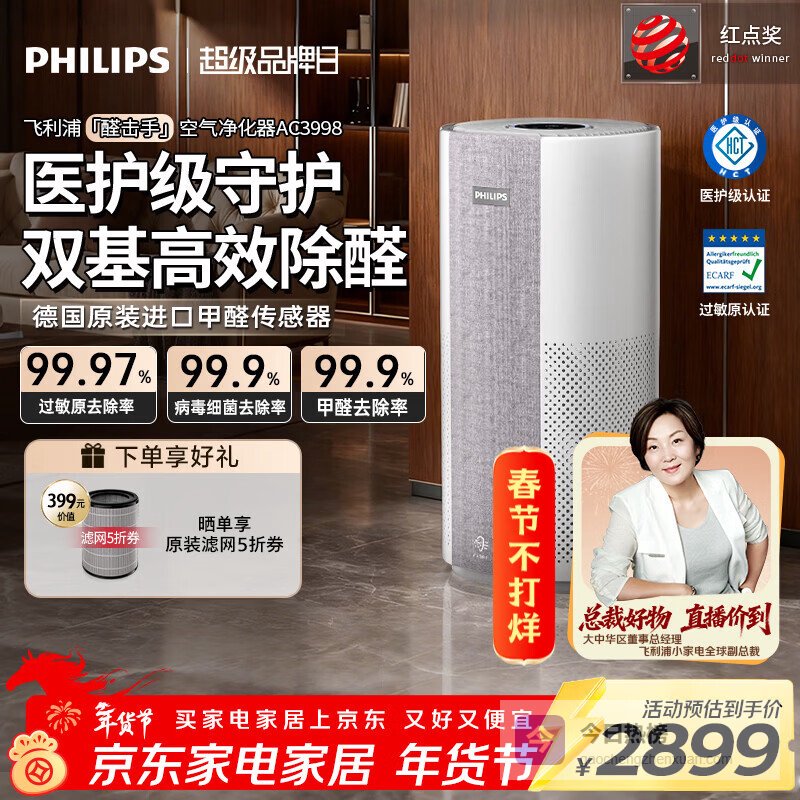 【京东自营】飞利浦空气净化器除甲醛神器新房急入住鼻炎专业家用宠物净化机除烟味病毒过敏原螨尘AC399¥