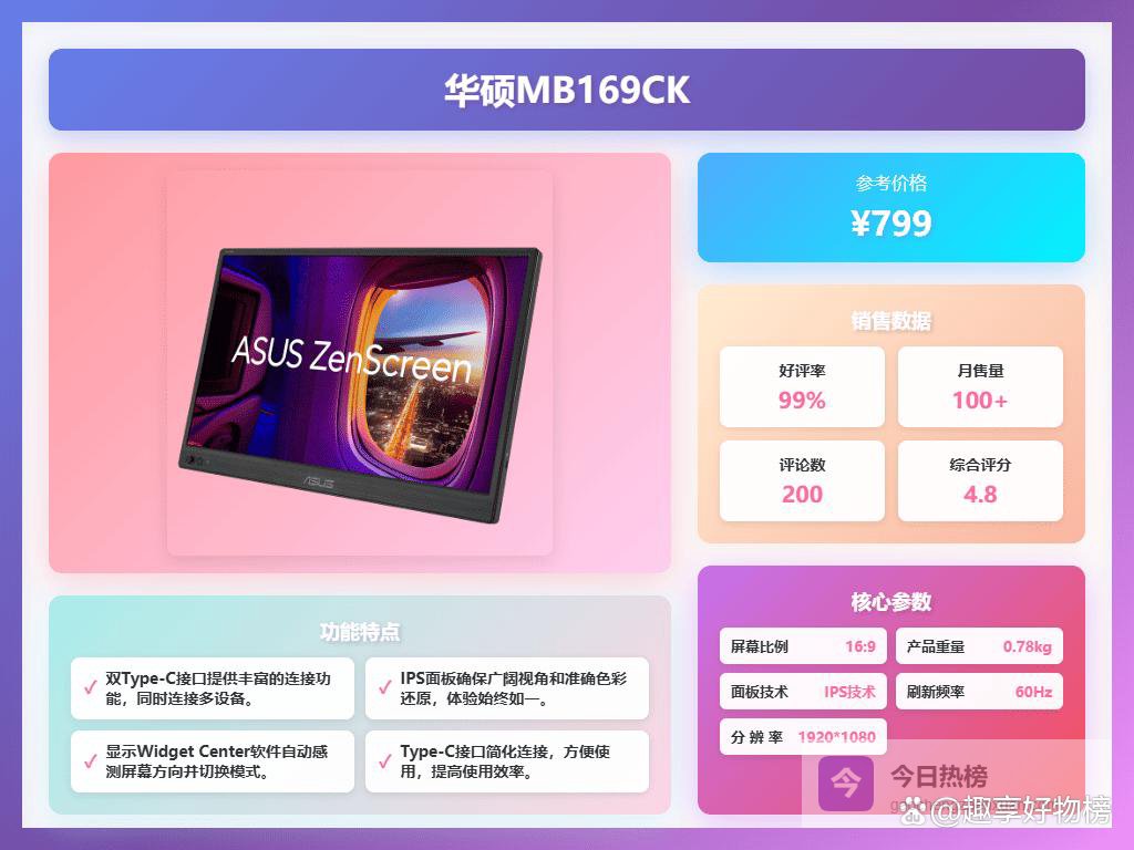 4、华硕MB169CK这款华硕MB169CK显示器配备了15.6英寸的FHD高清显示屏,提供清晰细腻的图像效果,日常工作或娱乐都能轻松应对。IPS面板确保了更广阔的视角和出色的色彩还原,无论从哪个角度观看,都能获得一致的视觉体验。有趣的是,它还支持不闪屏技术和滤蓝光功能,有效减缓眼部疲劳,长时间使用也更舒适。