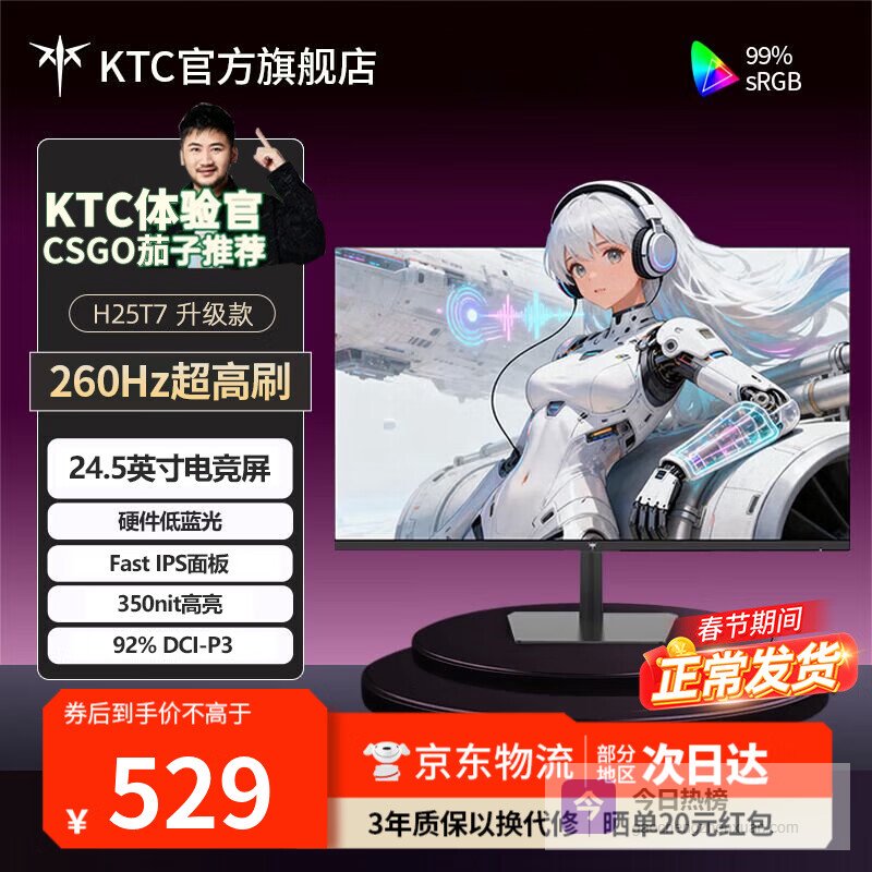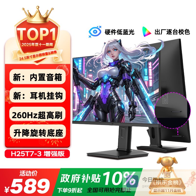 4、KTC H25T7-3代这款显示器配备了260Hz超高刷新率,能够带来极为流畅的画面表现,特别是在高速运动场景中,画面几乎没有撕裂和模糊。响应速度为0.001秒的Fast IPS面板,不仅确保色彩还原精准,还拥有宽广的视角,让多角度观看依然清晰自然。支持HDR400亮度提升,让暗部细节更加丰富,画面层次感明显增强。
