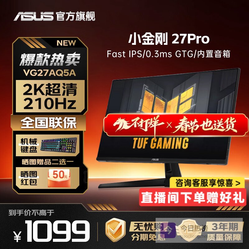 华硕(ASUS)TUF小金刚 27英寸2K显示器 高刷电竞 FastIPS显示屏 0.3ms响应 内置双音箱 G-sync 2K210Hz VG27AQ5A小金刚Pro¥