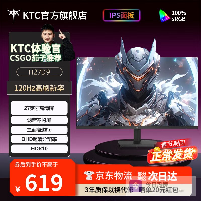 KTC 27英寸高清电竞显示器 窄边框 护眼不闪屏 办公家用设计剪辑游戏外接高刷电脑显示屏幕 2k 120Hz H27D9¥