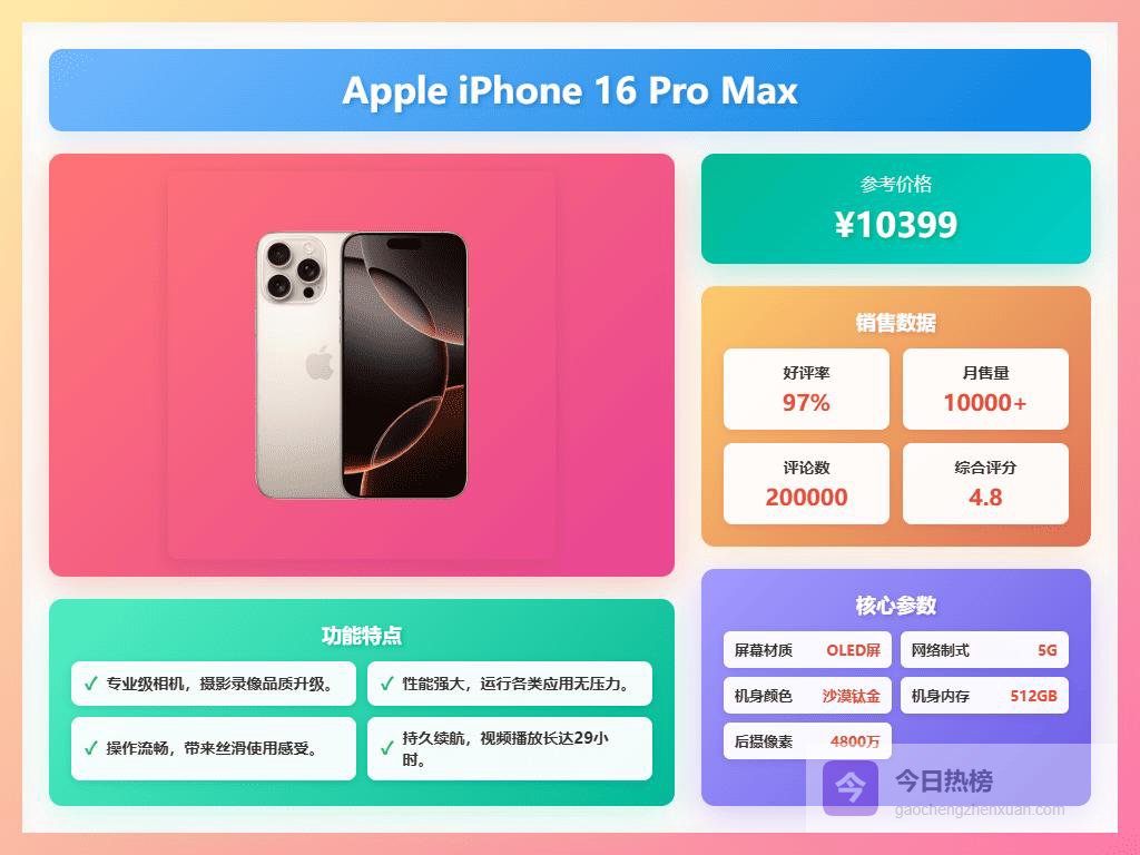 如果你预算充足,追求极致体验,那苹果的512G手机绝对值得考虑。全新的钛金属机身,手感高级又耐用,而且A18 Pro芯片的性能是真的强悍,玩什么游戏都是丝滑流畅,拍照效果更不用说,那叫一个真实自然。就是价格嘛,肯定会贵一些,但如果你是果粉,或者对手机性能有极致追求,咬咬牙上一个,绝对不会后悔。当然,如果你对折叠屏感兴趣,又喜欢华为的品牌,那华为的折叠屏手机也是个不错的选择,毕竟展开后的大屏用来看视频、玩游戏,那叫一个爽!
