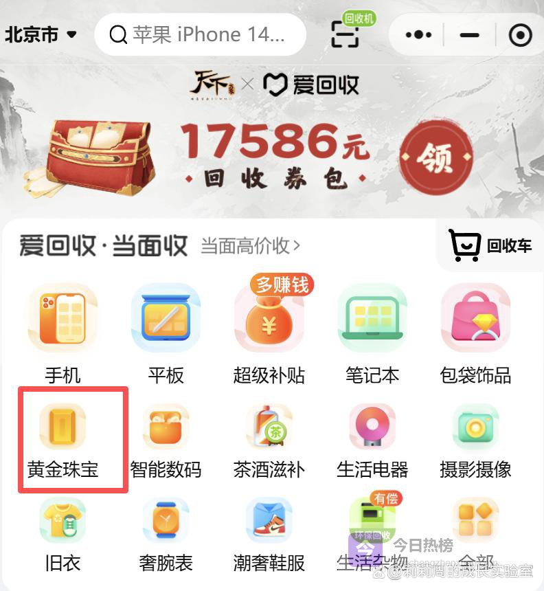 黄金回收入口 App / 小程序内有明确“黄金回收”入口 需要在综合回收或搜索中查找