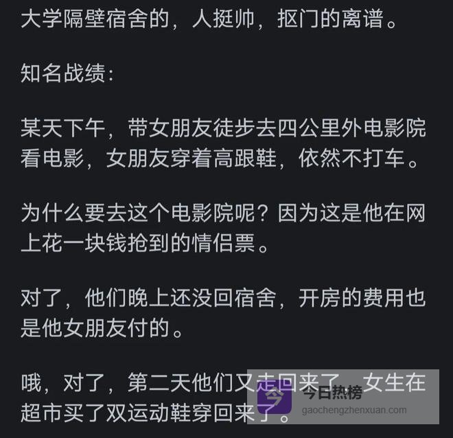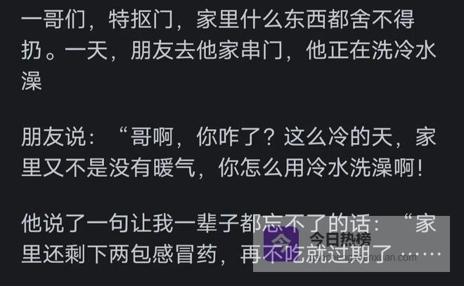 我大学室友男的,为了吃食堂免费粥和馒头,每早五点就去学校食堂门口排队。收集香皂渣放在小盒里用水泡后再塑形用。省理发钱留披肩发。去学校浴室两块钱一个人,他把所有的衣服被套床单带进去一起洗,后来学校浴室为了他改为计时刷卡的了