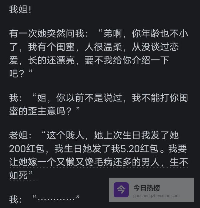我表弟老婆,表弟三十岁生日,她送三十几块钱的皮带;我儿子十岁生日,表弟买了一个玩具礼物,她知道了和我弟弟大吵一架;两人结婚前,我姑姑带他们买结婚的衣服,中午请我们吃了一顿饭,她气的在回去的路上从车上跳下来。这些事情我都是后来才知道,特后悔他们结婚的时候我送她的lv包包,白瞎了我一个lv。因为我们家族大多做生意,来往都是几千上万,我侄女比我小七岁,结婚我送dior戴妃包。我儿子十岁生日,一个玩具还能引发战争,服了。然后今年年三十,为了买羊肉又爆发,表弟快被干抑郁了,果断分居要离婚。只能说当代女版葛朗台吧。找一个同类型的能过,正常人受不住。