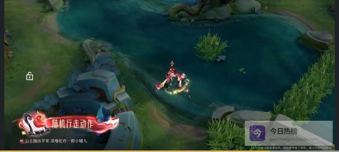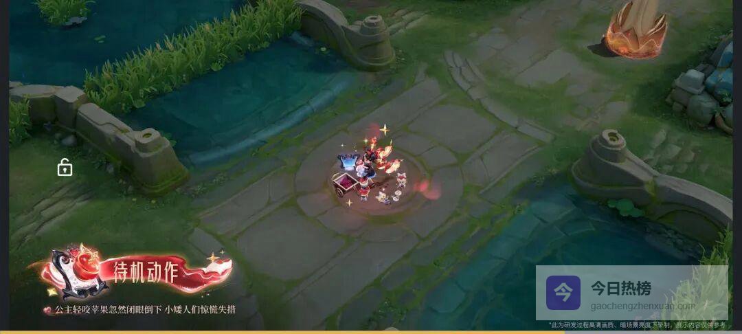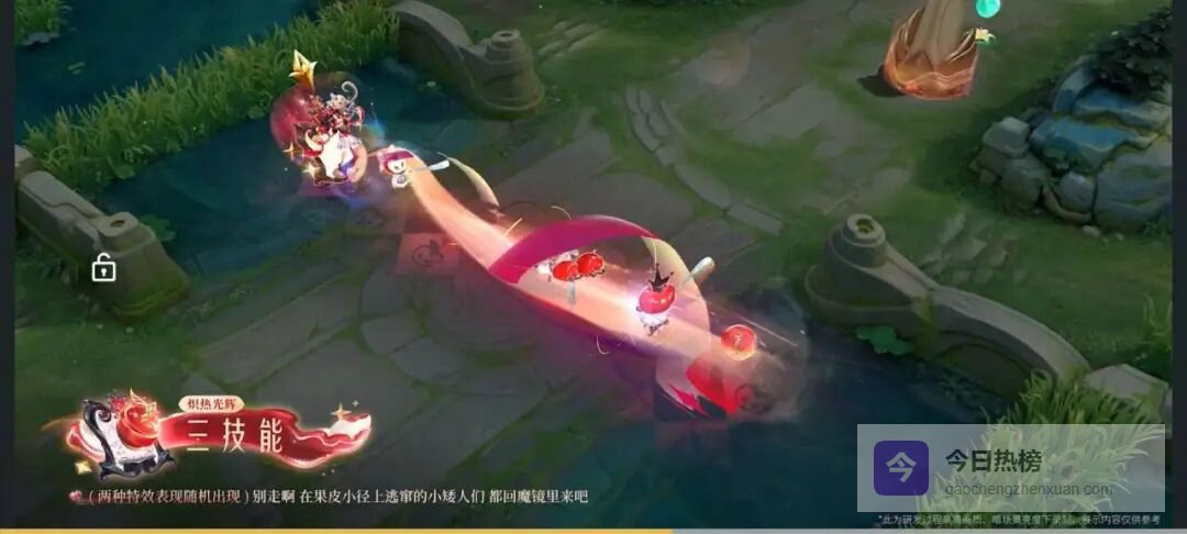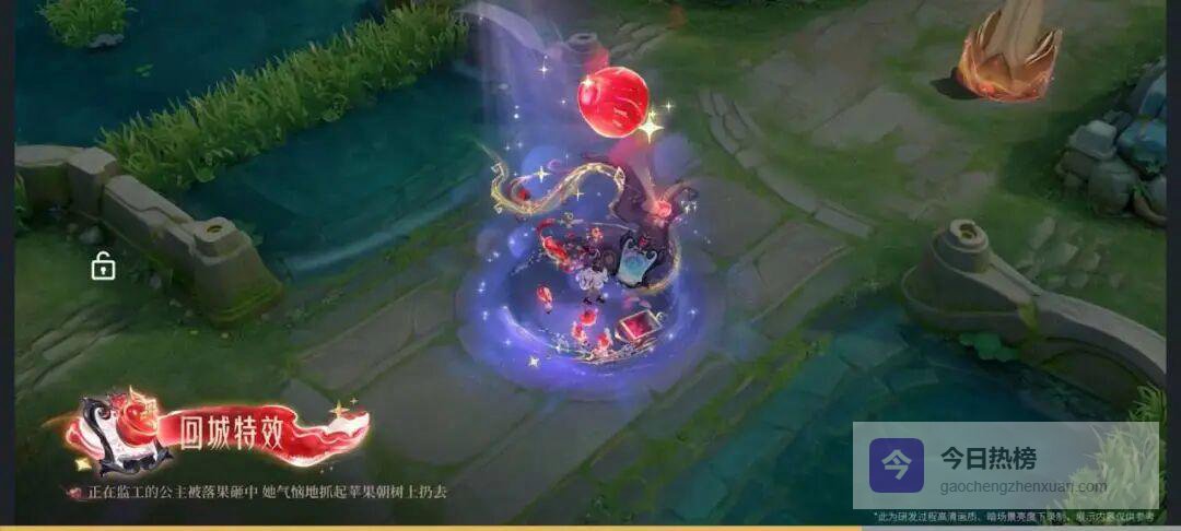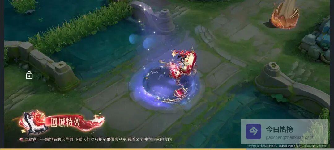 回城特效做得很有意思,掉下一个苹果,小矮人把苹果削成苹果车,安琪拉坐上苹果车回家。