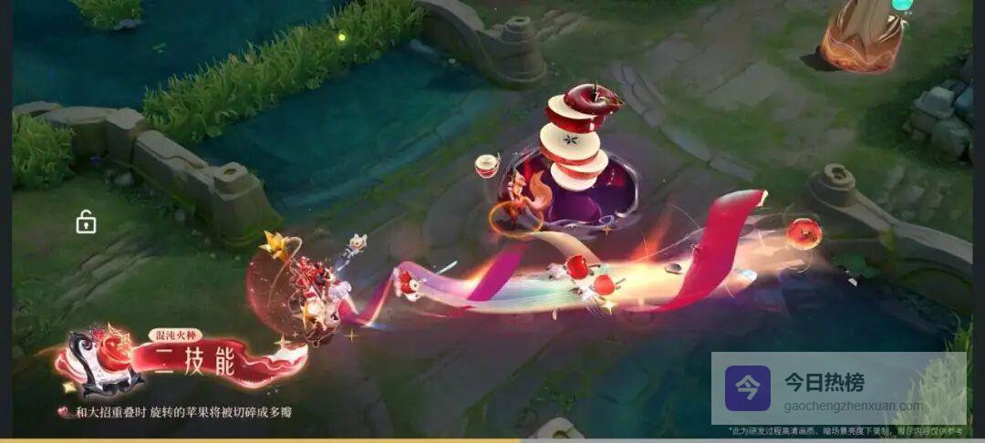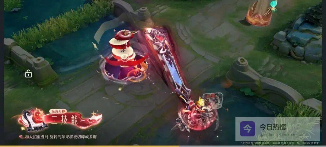 大招和二技能还有一个联动效果,用二技能,再用大招,大招是电锯就会把苹果切成苹果片。